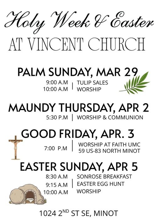 You are invited to join in the Dakota’s Conference Lenten Bible Study “To be Made Well” on Thursdays at 6pm beginning 2/19 at Vincent Church. We will have a meal, watch a video and discuss the healing stories in the Gospels. Please let the church office know if you will be attending. 701-838-4425