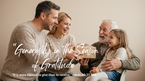 Holy God, we lift our gratitude for the generous hearts that surround us. We thank you for those who see need and respond with their gifts. We thank you for businesses and organizations that choose compassion. We thank you for the mystery of generosity, which multiplies what we share. Open our hearts wide in this season of thanksgiving. Help us to see, as others see us, that we are blessed most fully when we learn to give freely and cheerfully. May our hands become your hands. May our hearts become instruments of your love. In gratitude and grace, we pray. Amen.